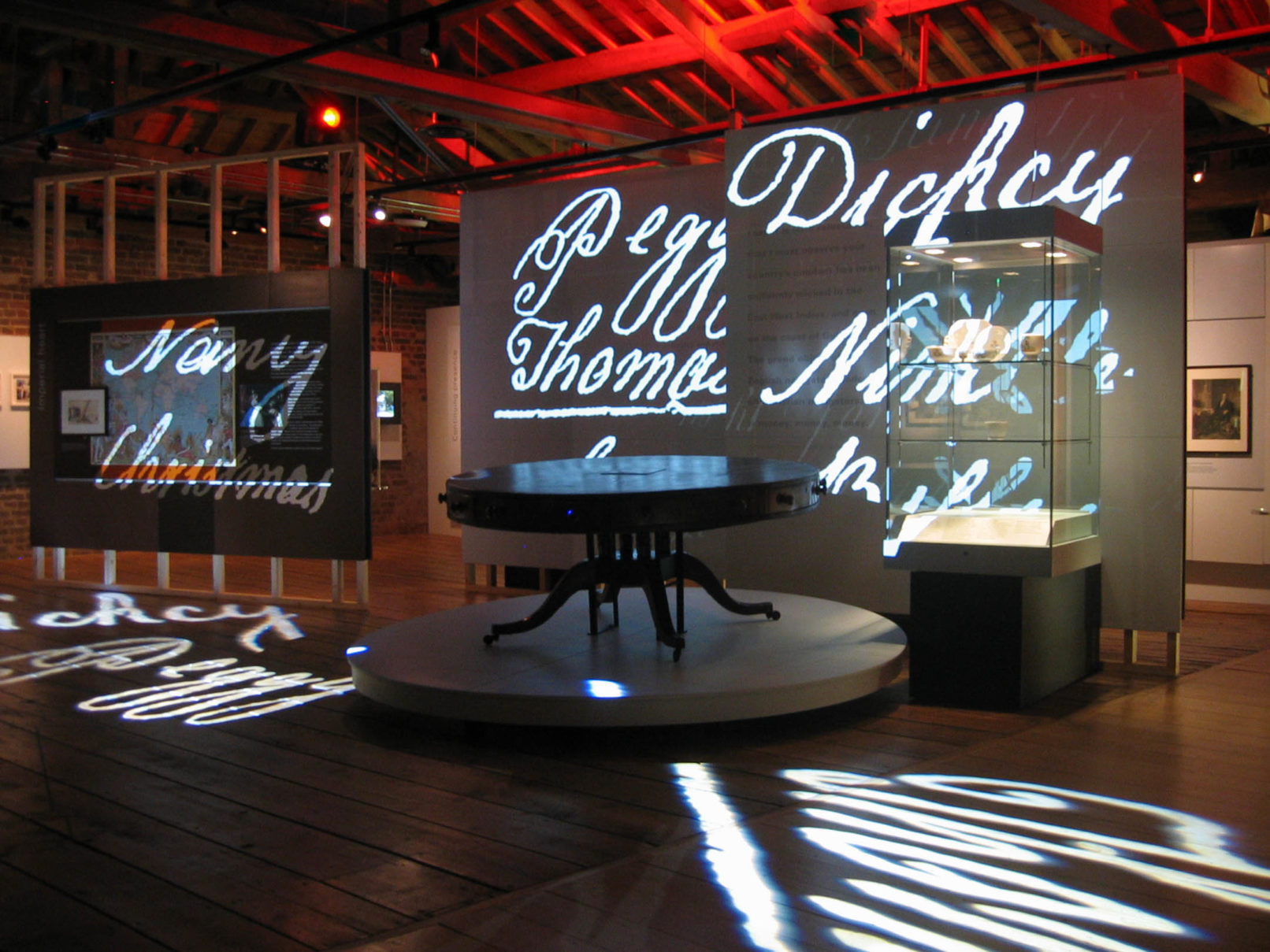The show takes over the gallery space projecting directly onto the exhibition panels, the artefacts, and at times down onto the audience, using video, gobos and lighting.