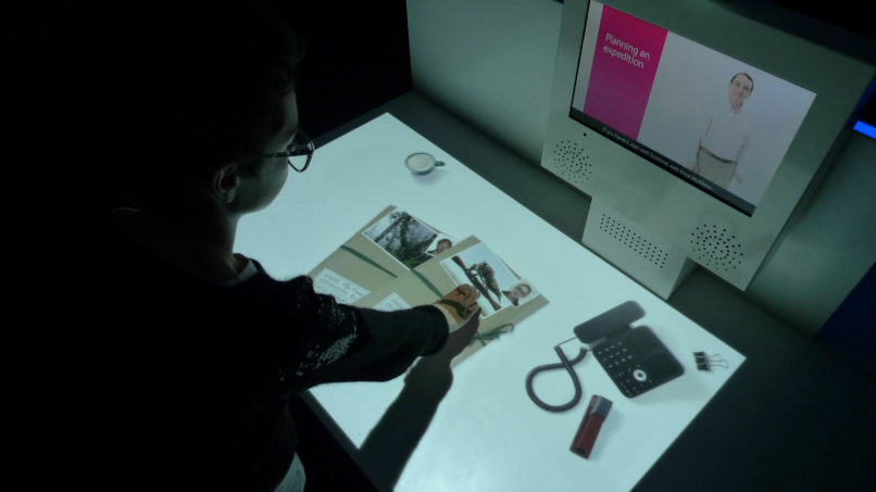 Visitors are asked to interact with specimens and tools projected on touch sensitive desks, with help from scientists who appear on overhead screens.
